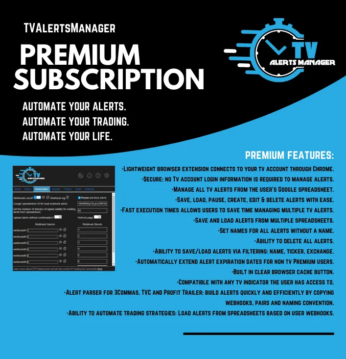 tvhubTVAlertsManager is a Chrome extension designed to automate and streamline the management of TradingView alerts. It allows users to create, edit, pause, and delete alerts using Google Sheets, saving time and enhancing efficiency. The service supports complex indicators, offers fast execution, and provides features like alert filtering, renaming, and expiration extensions. It offers batch operations for creating, reading, updating, and deleting TradingView alerts, eliminating manual work and making it especially useful for managing a large number of alerts. TVHub users can automate their trading strategies and manage alerts with ease, ensuring they stay aligned with market trends.